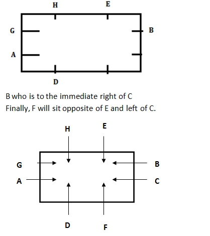 D faces North and sits exactly opposite to H. E; is to the immediate left of H. A and G sit on the same side. G is exactly opposite of B who is to the immediate right of C. A is next to the left of D.