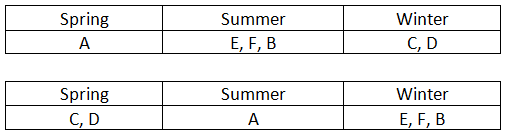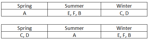 Answer 2: (d) For the common solution for this set, refer to solution of Question 1. From (b), A cannot be grown in winter. Hence option (a) is eliminated. From (c), C and D come together Hence option (b) is also eliminated. From (a) More than three flowers are not possible in a season. Hence, option (a) is also eliminated. The correct option is (d)