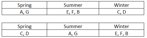 A commercial flower grower raises flowers in each of the three growing seasons every year-spring, summer and winter-with the year beginning in spring. Exactly seven different kinds of flowers- A, B, C, D, E, F and G-are grown every year. Each kind of flower is grown at least once a year. The flowers are grown according to the following rules: