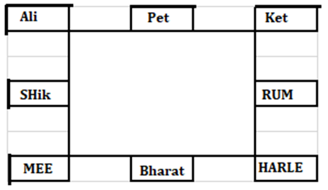 Eight friends, Meenal, Rumia, Shikha, Ali, Peter, Harleen, Ketan and Bharat are sitting around a square table in such a way that four of them sit at four corners of the square while four sits in the middle of each of the four sides. The ones who sit at the four corners face the centre while those who sit in the middle of the sides face outside.