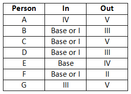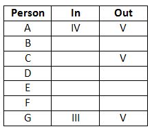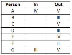 E gets in on base station and two others are also getting in with him but these two could be anyone either C & F or B & D. From the directions and the above discussion, we can make a table for In and Out: