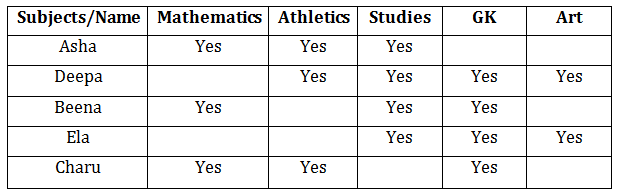 Answer 1:(d) From the above table, Deepa is good in Studies, General Knowledge, Athletics and Art. The correct option is (d)