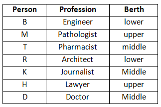 B, the Engineer is not in the upper berth. The architect is the only other person who occupies the same type of berth as that of B. M and H are not on the middle berth and their professions are Pathologist and Lawyer respectively. T is a Pharmacist. D is neither a journalist nor an Architect. K occupies same type of berth as that of the Doctor.