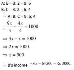 Question 8: The ratio of the incomes of A and B as well as of B and C is 3: 2. If one third of A’s income exceeds one fourth of C’s income by Rs. 1000, what is B’s income?