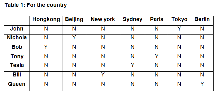 India invited representatives of seven countries to visit the Taj Mahal. The 7 representatives, John, Nichola, Bob, Tony, Tesla, Bill and Queen are from Hongkong, Beijing, New York, Sydney, Paris, Tokyo, Berlin(not in same order). 7 cars were sent to receive them from the airport. Each vehicle is of a different color and each representative selects a color of his choice. Three representatives are females. John likes the green color vehicle but John is not from Hong Kong or New York. The Chinese likes the grey colored vehicle and is a female. Tesla, who is the sister of Bill, is from Sydney and likes the Red-colored vehicle. Queen is from Berlin and likes the Orange colored vehicle. Bill, the wife of Bob is from New York and likes yellow color vehicle. Nichola likes Grey color vehicle and Bob likes Blue color and the one who likes Pink is from Paris.