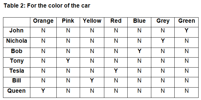 Other key inferences regarding the gender of the representatives: Bill, the wife of Bob is from New york and likes yellow colored vehicle Tesla, who is the sister of Bill, lives in Sydney and likes the Red colored vehicle The one who is from Beijing likes the grey colored vehicle and is a female, and from table 1, Nichola is from Beijing. Thus, Bill, Tesla and Nichola are the females while the rest are males.