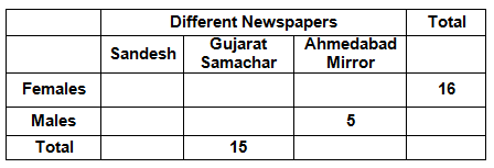In a housing society, the newspaper boy keeps data of readers and notes down the sales figures of different newspapers and the gender of newspaper readers. The data is kept on a copy but unfortunately lost certain portions of the dairy. He has the following incomplete data: