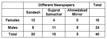 Since a total of 24 male readers are there and 8 out of these belong to Sandesh and 5 to Ahmedabad Mirror, the balance have to belong to Gujarat Samachar = 24 – 8 – 5 = 11 Now total number of readers who read Sandesh = 20