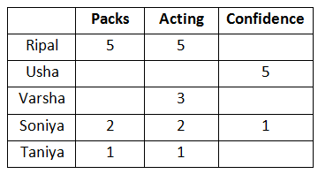 • Soniya gets 2 stars in packs and acting, and one star in confidence.