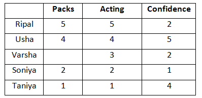 Answer 3: (d) Since all the one star, two star and five star ratings are gone, if we give three stars and four stars to one contestant, someone else will also get the same combination. Thus, two 4 stars i.e 8 stars in total have to be given to Ripal to ensure she wins this competition. Also from the options, option a) (5 marks) and c) (4 marks) are not possible as no one or two stars are available. If we give 6 marks to Ripal, then another candidate with 5 marks (Taniya or Usha) can get equal or more marks than Ripal (5+4+4 =13). Hence the option (d) is correct The correct options is (d).