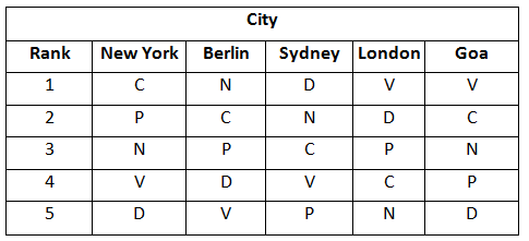 Answers 4: (a) Calculating the level of dissimilarity for New York with remaining cities Berlin : For the parameter N (3 –1) = 2 Sydney : For the parameter D (5 –1) = 4 London : For the parameter C (4 –1) = 3 Goa : For the parameter V (4 –1) = 3 ∴ The least level of dissimilarity is 2 which is for Berlin. The correct option is (a).