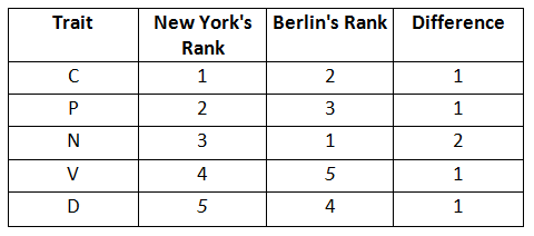 From the above table the maximum difference is 2. ∴ The dissimilarity level between New York and Berlin is 2.