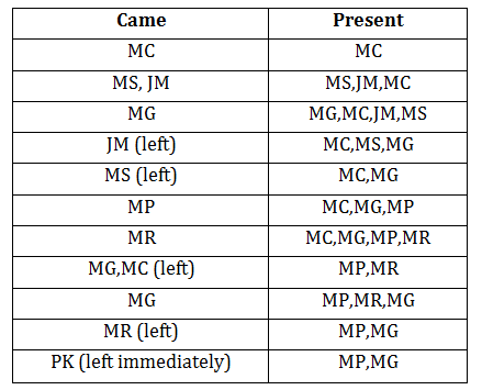MC: I came in first, and the next two persons to enter were MS and JM. When I left the lounge, MP and MR were present in the lounge. MG left with me.
