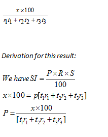 Example: The rate of interest for 3 years is 4%, 5years is 6%,1 years is 5%. If a man gets interest of Rs. 4700 for 9 years, calculate the principal amount?