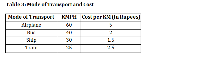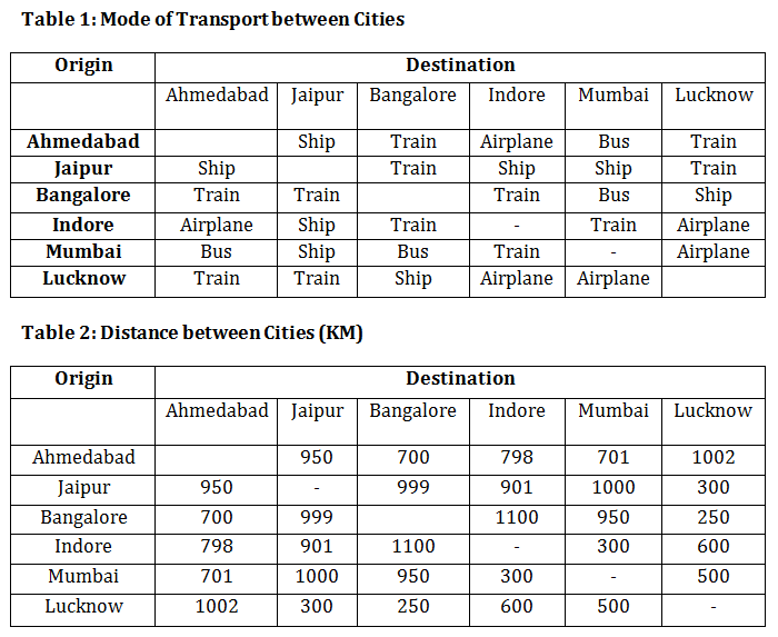 Ahmedabad, Jaipur, Bangalore, Indore, Mumbai and Lucknow are 6 major Indian cities. For some reason people use only a certain mode of transport between a pair of cities. The modes of transport are provided in Table 1, while in Table 2 the distances between different pairs of cities are given. Table 3 provides the speed of the mode of transport and the cost associated with each of them.
