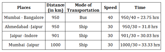 Answers 5: (C) Time to reach each of the cities is shown below. Ahmedabad – Jaipur (by Ship) = 950/30 = 31.67 hrs Ahmedabad – Bangalore (by Train) = 700 / 25 = 28 hrs Ahmedabad – Mumbai (by Bus) = 701 /40= 17.525 hrs Ahmedabad – Lucknow (by Train) = 1002/25 = 40.08 hrs The correct option is (C).