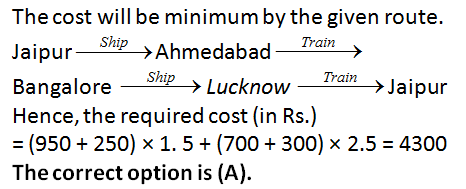 Answers 3: (B) The costs for each of the given route is shown below. Indore – Lucknow = 600 × 5 = Rs. 3000. Indore – Jaipur – Lucknow = 901 × 1.5 + 300 × 2.5 = Rs. 2101.5. Indore – Bangalore – Lucknow = 1100 × 2.5 + 250 × 1.5 = Rs. 3125. Indore – Mumbai – Lucknow = 300 × 2.5 + 500 × 5 = Rs. 3250. The correct option is (B).