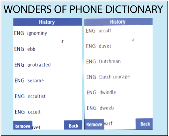 I think one of my biggest challenges with respect to learning words was breaking the traditional mode of studying: I was in the habit of picking up a dictionary every time I discovered a new word. Plus I was one of the least web-savvy people in my college days. When did the transformation take place and I converted into a guy running a full-time website is something that beats me as well, but I learned invaluable lessons along the way: the first one being the infinite potential of the web when it comes to learning. Online Dictionaries are simple and user-friendly, plus they add a plethora of information on the same screen. The need for a thesaurus is eliminated and most provide the word usage there and then. Along with this, we always have Google to fall back and explore virtually any facet of the word at hand. This is all fascinating when we talk of the web world, but when it comes to taking one’s learning to the next level, we have another nifty little device to help us out: our mobile phone. Screens are getting bigger and brighter, and so seem to be our learning opportunities on the phone. I was just browsing through my phone dictionary and all of a sudden I discovered that my inbuilt phone dictionary could actually teach me quite a few words. Below is a screen picture of my dictionary history, which reminds me all the words I looked up.