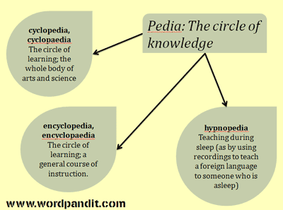 Another interesting derivation from the same root is of the Greek word pedeia. In ancient Greek society, it meant education or upbringing; more generally, a society’s culture; the sum of physical and intellectual achievement to which the human body and mind can aspire. In fact, the source root of all of the above, the Greek ped is a word meaning “education” or the results of “education”; such as, “knowledge” or “learning”. The Greek element pedia is found in other Greek words; such as, “cyclopedia” and “encyclopedia”, and can be referred to as the circle of knowledge.