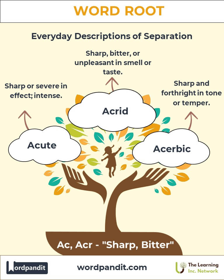 - Acri (sharp or bitter): Examples: Acrimony, acrimonious.