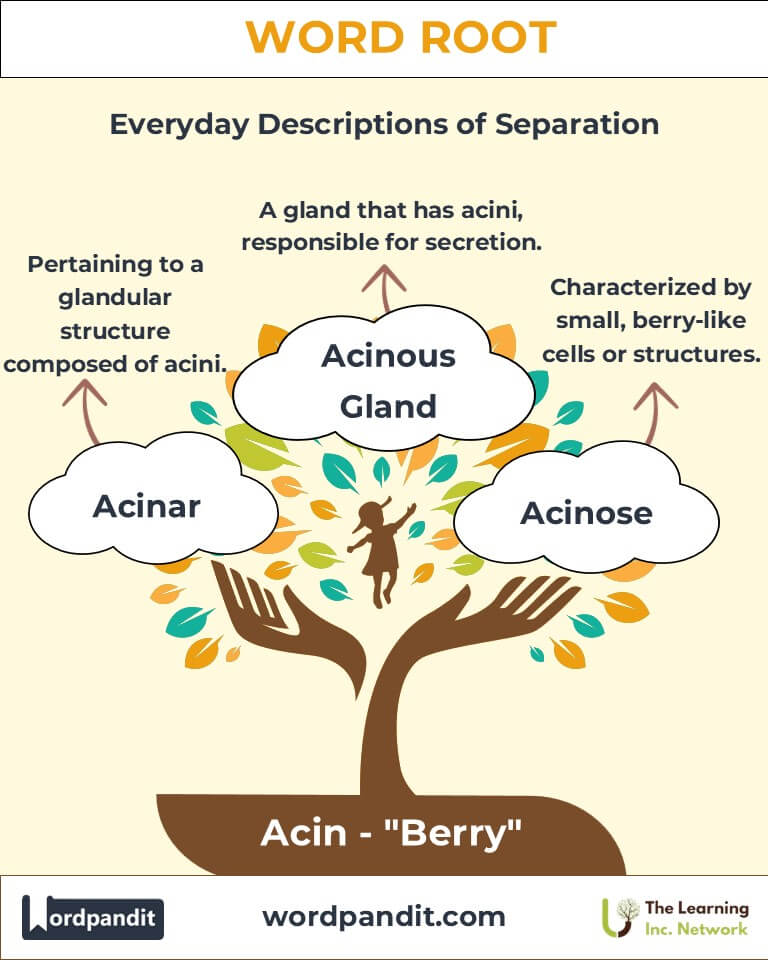 The word root "acin" (pronounced AY-sin) originates from the Latin word acinus, meaning "grape" or "berry." Just as grapes cluster together to form a rich vine, the root "acin" clusters meaning into various fields, especially biology. From describing tiny, grape-like structures in anatomy to metaphorically representing abundance, "acin" has enriched language with imagery and precision.