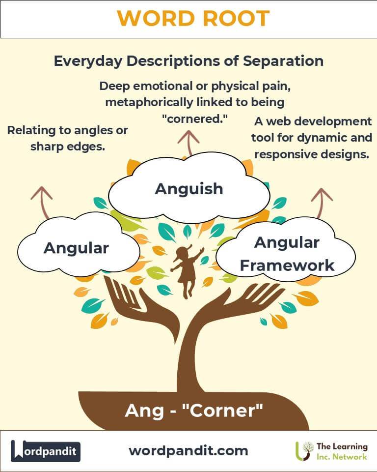 A: The root "ang" means "corner" or "angle" and is derived from the Latin angulus. It serves as the foundation for words related to geometry, design, and even emotional states. For instance, "angle" describes the meeting point of two lines, while "anguish" metaphorically captures the feeling of being trapped or cornered.