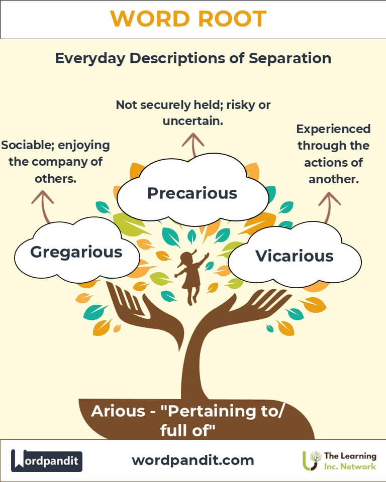 A: The suffix "-arious" indicates qualities, states, or conditions associated with the root word. For example, "various" describes a range of different types or kinds, while "gregarious" conveys the state of sociability. It enriches language with descriptive depth and categorization.