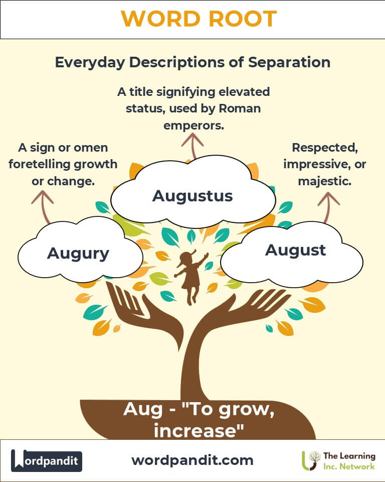 A: The root "Aug" originates from the Latin augere, meaning "to grow" or "increase." It signifies enhancement or expansion, appearing in words like "augment" (to make greater) and "august" (grand or majestic).