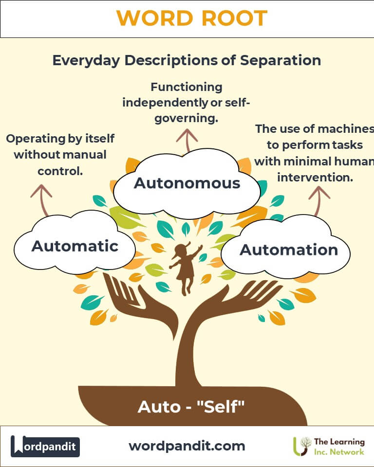 A: "Auto" means "self," originating from the Greek root "autos." This root emphasizes independence, self-direction, and autonomy. Words like "autonomy" (self-governance) and "automatic" (self-operating) highlight the versatility of this root.