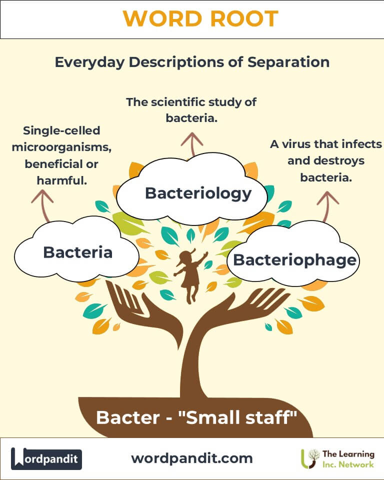 Did you know that every teaspoon of soil contains millions of bacteria? The root "Bacter," pronounced "back-ter," highlights the microscopic world that sustains life on Earth. Stemming from the Greek word "baktērion," meaning "small staff," this root captures the essence of bacteria’s rod-like shape as seen under early microscopes. From advancing medicine to transforming industries, "Bacter" is fundamental in understanding life and innovation.