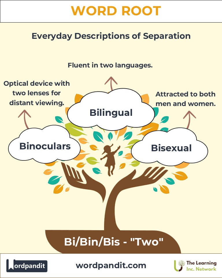 The root "Bi/Bin/Bis" derives from the Latin prefix bi- (two) and its variant forms bin- (two by two) and bis- (twice). It entered English during the Middle Ages through Latin and Old French, gaining prominence in disciplines that value precision, such as mathematics and linguistics.