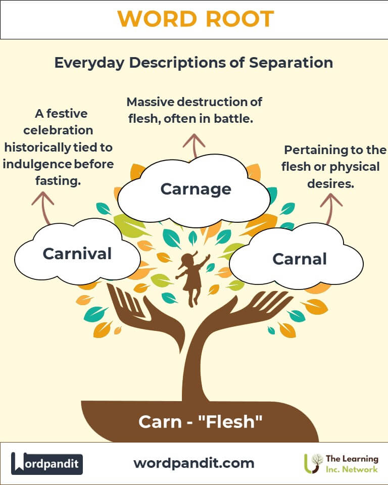 The root carn traces its origins to the Latin caro, which referred to flesh or meat. In Roman times, it described both the physical material of animals and the metaphorical essence of indulgence or mortality. Over centuries, carn became integrated into English through French and Italian influences, enriching our vocabulary with words that evoke physicality, sustenance, and festivity.