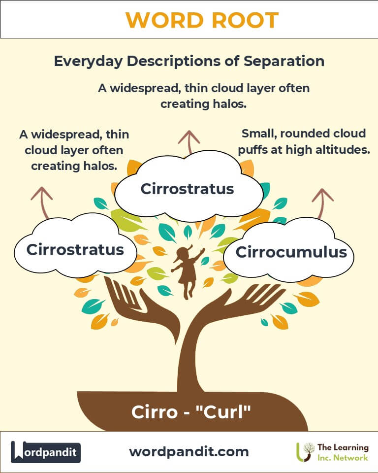 The word root "cirro" traces back to the Latin cirrus, meaning "curl" or "tendril." Early Roman naturalists used the term to describe wispy, hair-like clouds. As science evolved, "cirro" gained prominence in meteorology and medicine, illustrating both the beauty of nature and the complexity of human anatomy.