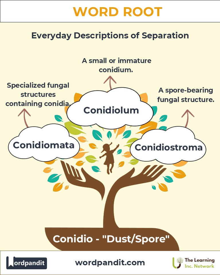 Discover the fascinating world of the word root "Conidio," derived from the Greek word "konis," meaning "dust," and used in biology to refer to fungal spores. Explore its relevance in scientific terminologies like conidiophore and conidiogenesis, which highlight the intricate processes of fungal reproduction and dispersal.