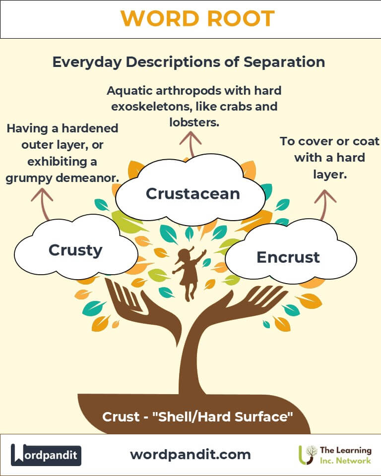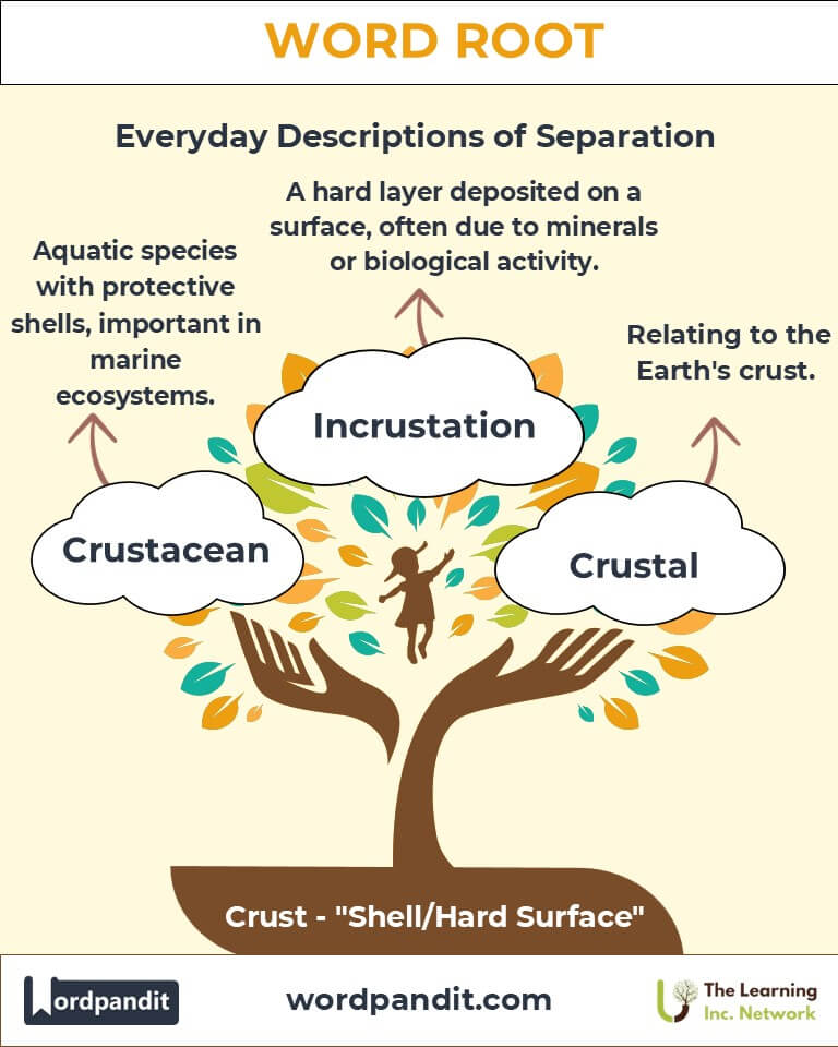 The root "crust" embodies protection and rigidity, extending from Earth’s geology to marine biology and even culinary arts. Its applications remind us of the interconnectedness of nature’s structures and human innovations. As we explore this root, we uncover layers of meaning that enrich our understanding of the world around us.