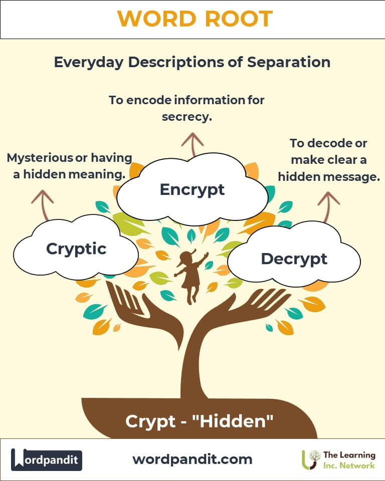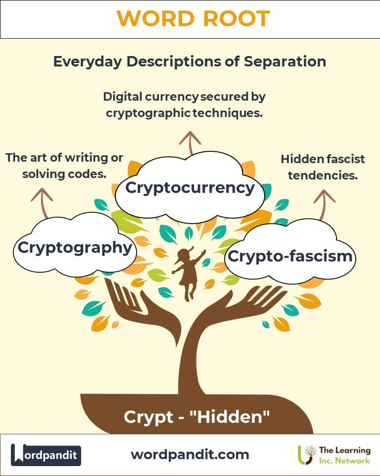 When you hear the word “crypt,” do you imagine a hidden vault or a mysterious code? The root "crypt" (pronounced kript) captures the essence of concealment and mystery. Derived from the Greek word kryptos, meaning hidden, this root has seeped into words describing secretive systems, enigmatic texts, and even physical spaces for safekeeping.