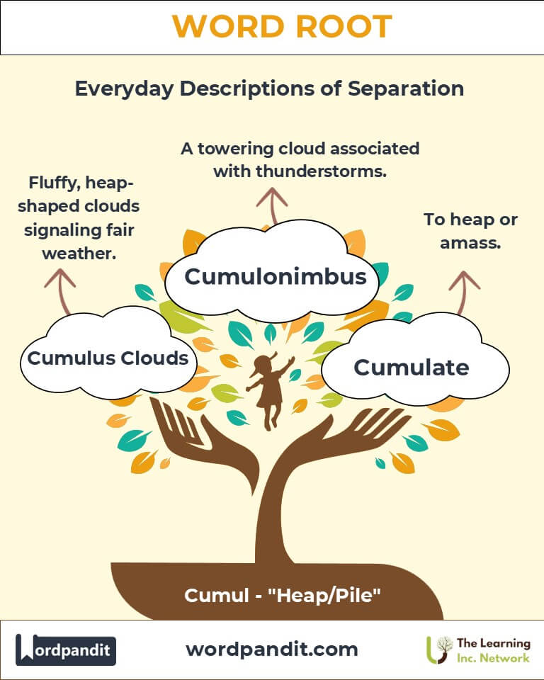 Discover the fascinating journey of the root "cumul," derived from Latin, meaning "heap" or "pile." This versatile root finds expression in words that describe accumulation, growth, and towering formations in both natural and abstract contexts. From fluffy cumulus clouds in the sky to the act of accumulating wealth or knowledge, "cumul" speaks to the art of gathering and layering.