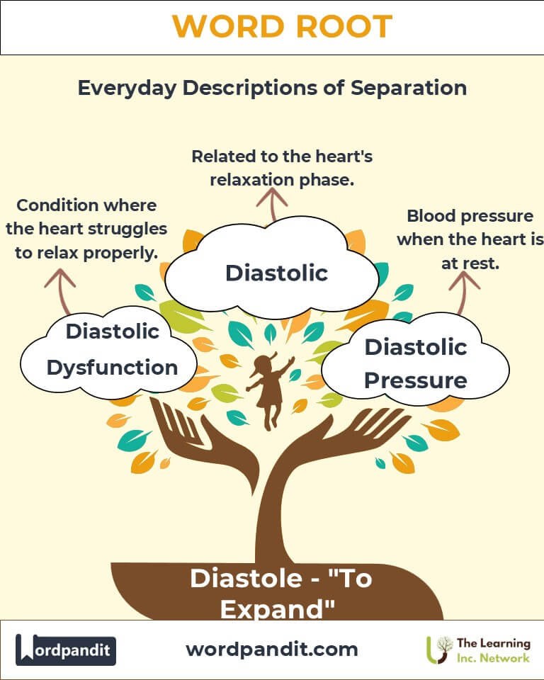 The root "diastole" bridges medicine, language, and culture, symbolizing expansion and potential. From the rhythmic beats of the heart to poetic meters, it reflects life’s dynamic balance. Let "diastole" remind us of the power of rest, readiness, and resilience in every aspect of our lives.