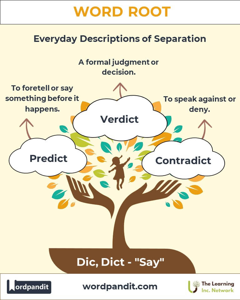 The roots "dict" and "dic" trace back to the Latin verb dicere, meaning "to say" or "declare." In ancient Rome, dictum referred to a formal pronouncement or saying, often tied to legal and political authority. Over centuries, these roots merged with Old French and English, giving rise to words like "dictate," "predict," and "dictionary." Their evolution underscores the timeless importance of spoken and written words in law, governance, and everyday life.