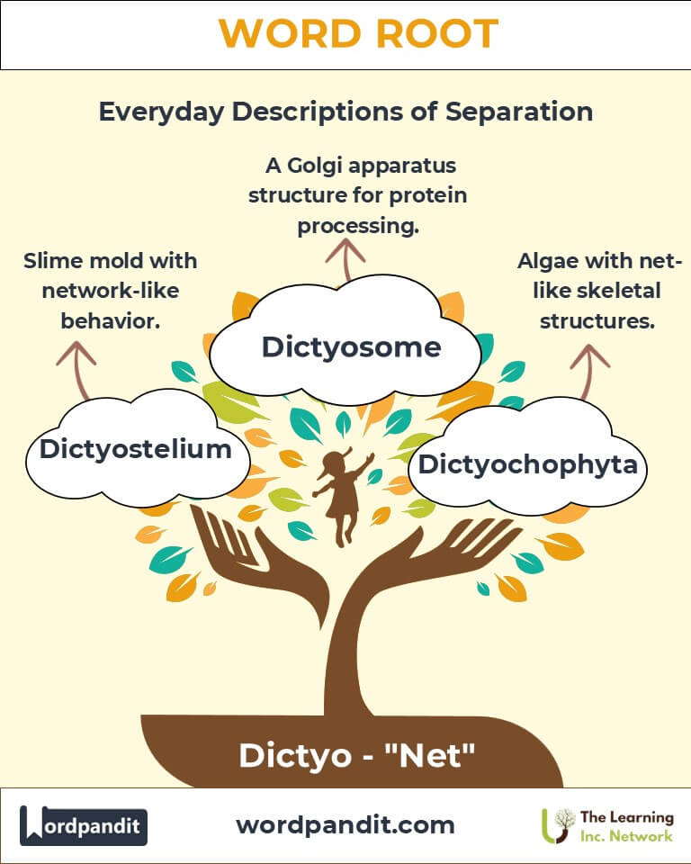 A: "Dictyo" means "net" or "network," derived from the Greek word "diktyon." It represents structures that are interwoven, interconnected, or arranged like a web, commonly seen in biological and structural contexts.