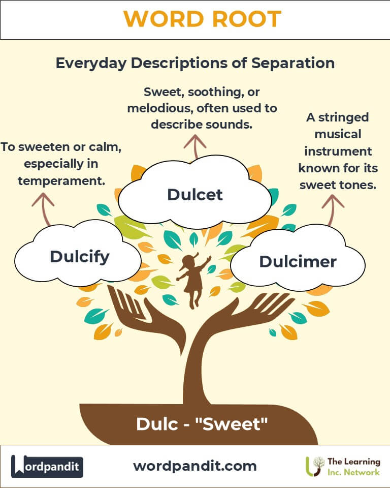 Expanded Explanation: Terms like dulcet for melodious sounds, dulcify for calming emotions, and dulcimer for sweet music highlight the versatility and cultural significance of this root.