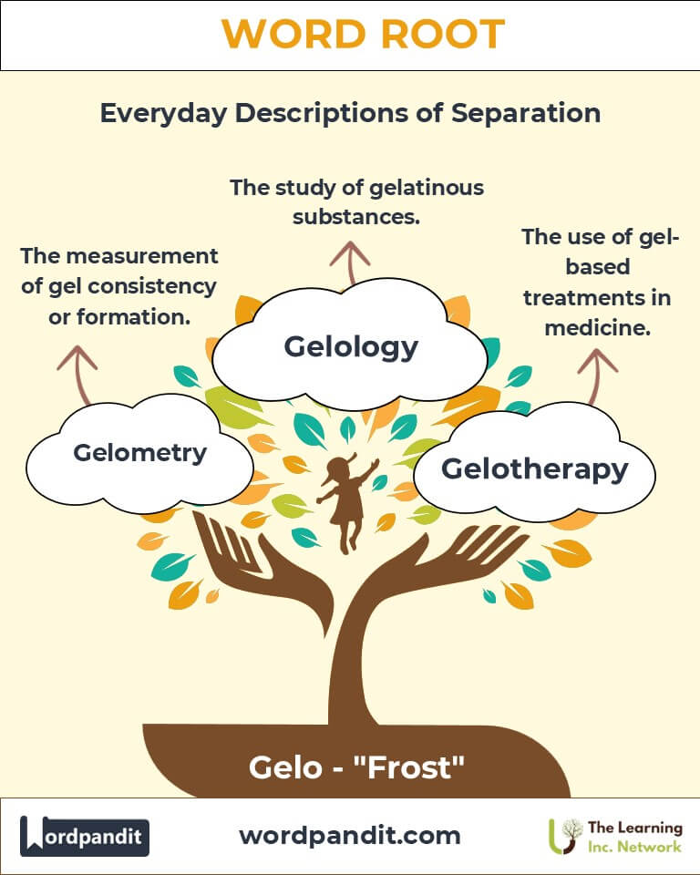 The root "gelo" traces its origin to the Latin word gelu, meaning frost, ice, or cold. The term encapsulated the transformative power of freezing in ancient Rome, where "gelu" referred to both physical coldness and the emotional state of being frozen in fear. Over centuries, it evolved into words like "gelatin" in English, emphasizing congealed or semi-solid states, particularly in food and scientific contexts.