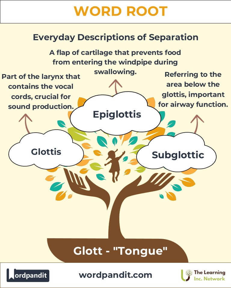 Discover the fascinating root "glott," derived from Greek, meaning "tongue." Found in terms like "glottis" and "epiglottis," this root highlights the intricate role of the tongue in speech and anatomy, revealing its vital contributions to language, breathing, and more.