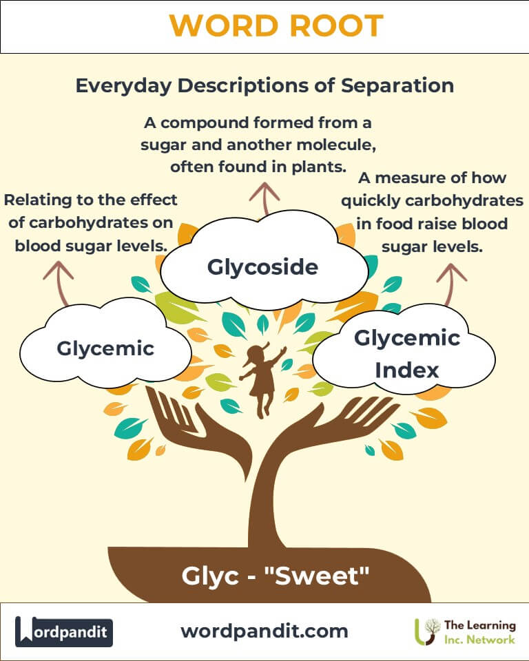 Terms like glycemic index and glucose monitoring are rooted in "glyc." Managing blood glucose levels through diet, exercise, and medication helps prevent complications like nerve damage or heart disease.