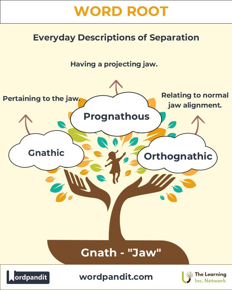 The root gnath (pronounced nay-th or guh-nath) carries the weight of biological importance, literally and figuratively. Derived from the Greek word gnathos, meaning "jaw," this root underpins terms that describe jaw-related anatomy and characteristics. Whether in humans or animals, the jaw plays a crucial role in chewing, speaking, and expressing emotions. Words like "gnathic" and "prognathous" explore this root's applications in fields such as medicine, anthropology, and zoology.
