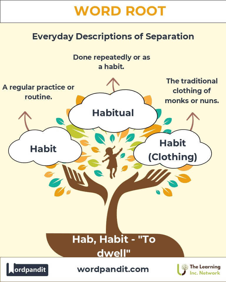 The roots hab and habit derive from the Latin habere, meaning "to have or hold." Over centuries, they evolved to signify both physical residence ("habitat") and mental or physical tendencies ("habit"). In the Middle Ages, habit expanded into clothing, reflecting a monk’s customary garb. From ancient Rome to modern English, these roots have enriched language with meanings tied to possession, dwelling, and routine.