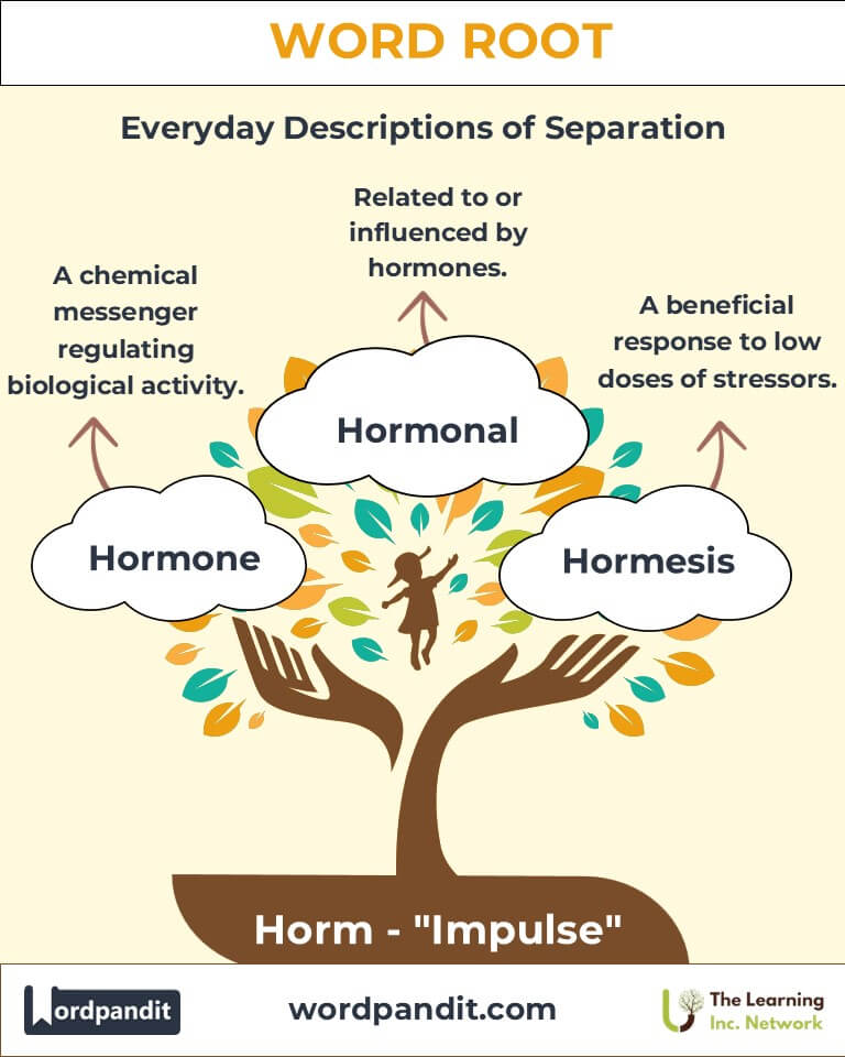 Have you ever wondered how our body knows when to grow, act, or react? The root "horm," pronounced "horm" (just like it looks), means "impulse" in Greek and serves as the foundation for words describing signals and stimulants. Central to biology, this root encapsulates the processes that initiate action and movement, both physical and metaphorical.