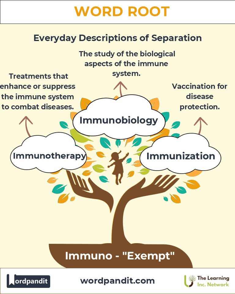 The root "immuno" represents humanity's triumph over disease and commitment to health. As science progresses, this root continues to drive innovation, embodying resilience and hope for the future.