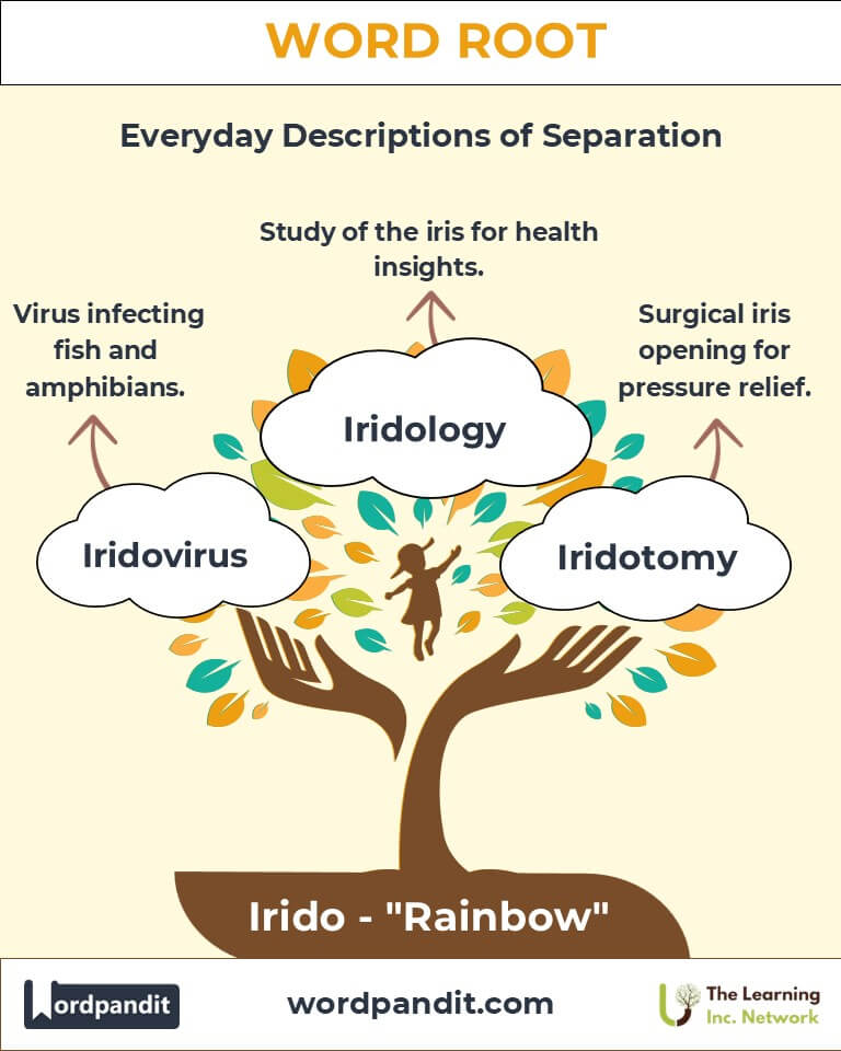 When you see the colors of a rainbow or the shimmer of a soap bubble, you’re witnessing the beauty encapsulated by the root "Irido." Pronounced ir-ih-do, this root originates from the Greek "iris," symbolizing both the rainbow and the goddess who served as a messenger in Greek mythology. It captures the interplay of color and light, which extends beyond mere aesthetics into fields like medicine, optics, and art.