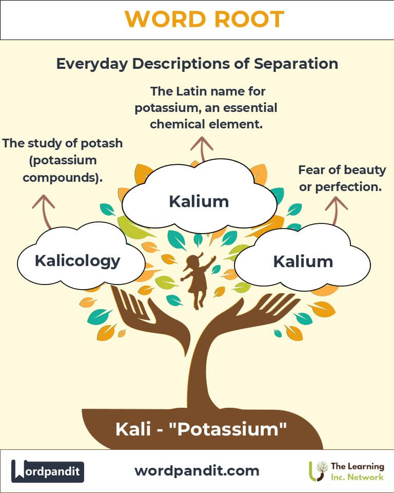 From the spark of an ancient alchemical experiment to the fizz of soda in your glass, the root "Kali" captures the dynamic essence of potassium—a chemical element central to life and chemistry. Derived from the Arabic word al-qaly (meaning "ashes of plants"), Kali has contributed not only to scientific terminology but also to our understanding of essential biochemical processes. Pronounced KAH-lee, this root appears in terms like "kalium" and "alkali," shaping a legacy of discovery and utility.